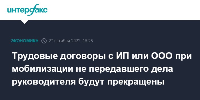 Трудовые договоры с ИП или ООО при мобилизации не передавшего дела руководителя будут прекращены