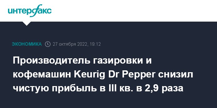 Москва. 27 октября. INTERFAX.RU - Американский производитель безалкогольных напитков, чая, кофе, а также кофемашин и комплектующих Keurig Dr Pepper Inc в третьем квартале 2022 года сократил чистую прибыль в 2,9 раза под влиянием инфляционного давления.