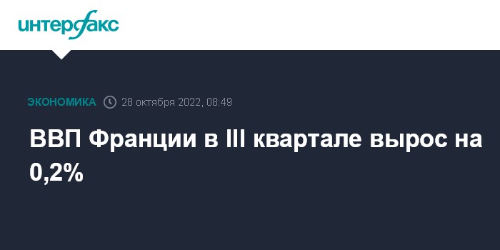 Москва. 28 октября. INTERFAX.RU - Объем ВВП Франции в третьем квартале увеличился на 0,2% по сравнению с предыдущими тремя месяцами, свидетельствуют предварительные данные национального статистического института Insee.