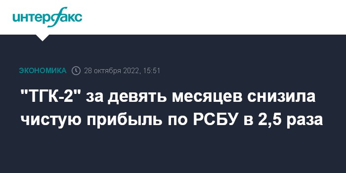 Москва. 28 октября. INTERFAX.RU - ПАО "ТГК-2" в январе-сентябре 2022 года получило 471 млн 850 тыс. рублей чистой прибыли, что в 2,5 раза меньше, чем за аналогичный период прошлого года, говорится в отчете компании по РСБУ.