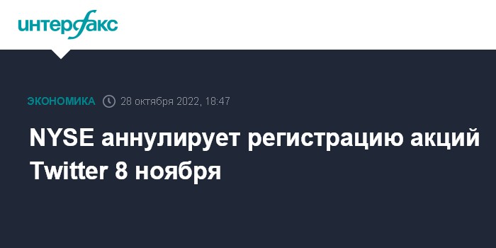 Москва. 28 октября. INTERFAX.RU - Нью-Йоркская фондовая биржа (NYSE) уведомила Комиссию по ценным бумагам и биржам (SEC) о намерении аннулировать регистрацию акций Twitter Inc. на бирже 8 ноября.