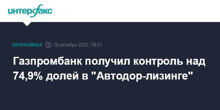 Москва. 28 октября. INTERFAX.RU - Газпромбанк через дочерние структуры получил контроль над 74,9% долей в ООО "Автодор-лизинг", созданном для обновления парка дорожно-строительной техники в России, сообщила госкомпания "Автодор".