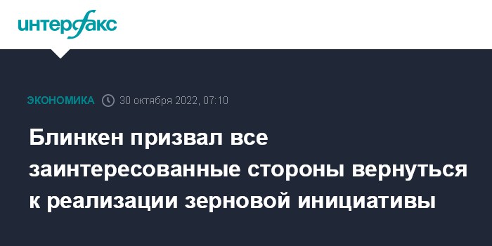 Москва. 30 октября. INTERFAX.RU - Госсекретарь США Энтони Блинкен призвал все стороны соглашения по вывозу зерна из украинских черноморских портов вернуться к его выполнению, сообщил американский госдепартамент.
