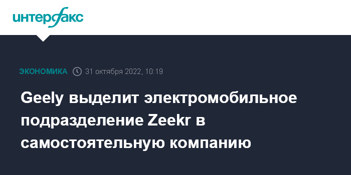 Москва. 31 октября. INTERFAX.RU - Китайская Geely Automobile Holdings Ltd планирует выделить в самостоятельную компанию подразделение по выпуску электромобилей Zeekr Intelligent Technology и разместить ее акции на бирже.
