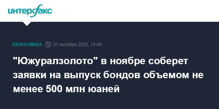Москва. 31 октября. INTERFAX.RU - Компания "Южуралзолото" в середине ноября планирует провести сбор заявок на 2-летний выпуск облигаций объемом не менее 500 млн юаней, сообщил "Интерфаксу" источник на финансовом рынке.