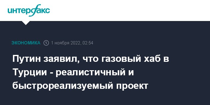 Москва. 1 ноября. INTERFAX.RU - Газовый хаб в Турции - это реалистичный проект, который достаточно быстро можно реализовать, заявил президент России Владимир Путин в ходе пресс-конференции в понедельник.