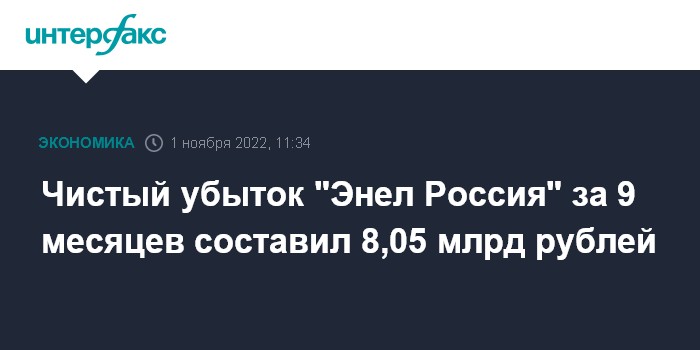 Москва. 1 ноября. INTERFAX.RU - В январе-сентябре 2022 года чистый убыток ПАО "Энел Россия" составил 8,05 млрд рублей против чистой прибыли 2,45 млрд рублей годом ранее, следует из отчета компании.