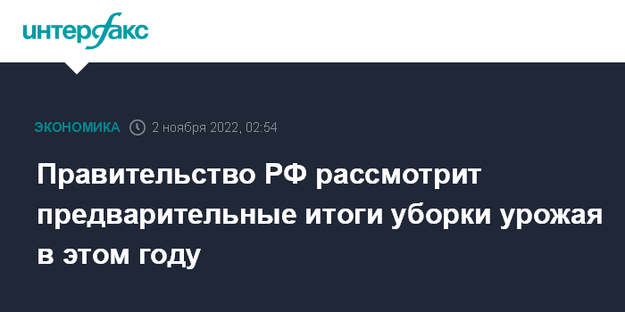 Москва. 2 ноября. INTERFAX.RU - Правительство РФ планирует рассмотреть предварительные итоги уборки урожая 2022 года.