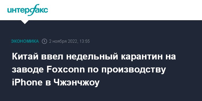 Москва. 2 ноября. INTERFAX.RU - Власти Китая ввели семидневный локдаун в районе завода по производству iPhone тайваньской Foxconn Technology Group в городе Чжэнчжоу, сообщает агентство Bloomberg.