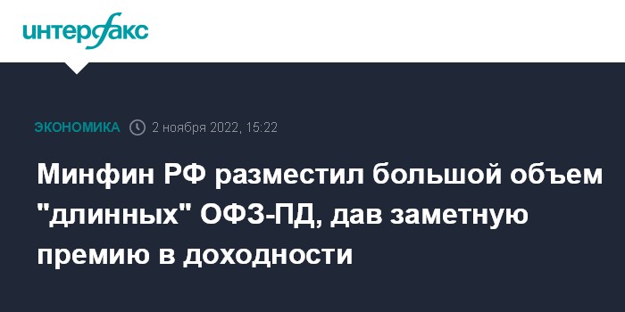 "После возобновления торгов ОФЗ 21 марта 2022 года активность инвесторов и объемы торгов на вторичном рынке ОФЗ значительно снизились. С целью активизации вторичного рынка ОФЗ и максимизации объема привлечения на аукционе 2 ноября 2022 года по размещению 15-летнего выпуска ОФЗ-ПД принято решение установить цену отсечения на уровне, где был предъявлен значительный объем спроса инвесторов. Была предложена премия по доходности ОФЗ-ПД, позволяющая максимизировать объем привлечения, что оправдано для одного из наиболее долгосрочных из имеющихся долговых инструментов с фиксированным доходом в условиях низкой ликвидности долгового рынка и повышенных инфляционных ожиданий со стороны инвесторов", - прокомментировал итоги аукциона Минфин.