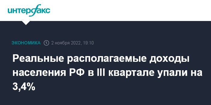 Москва. 2 ноября. INTERFAX.RU - Снижение реальных располагаемых доходов населения РФ в III квартале 2022 года составило 3,4% в годовом сравнении, говорится в докладе Росстата за январь-сентябрь.