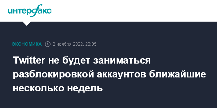 Москва. 2 ноября. INTERFAX.RU - Предприниматель Илон Маск, в октябре купивший соцсеть Twitter, не исключает разблокировки заблокированных ранее аккаунтов, но предупреждает, что на разработку плана для этого потребуется несколько недель.