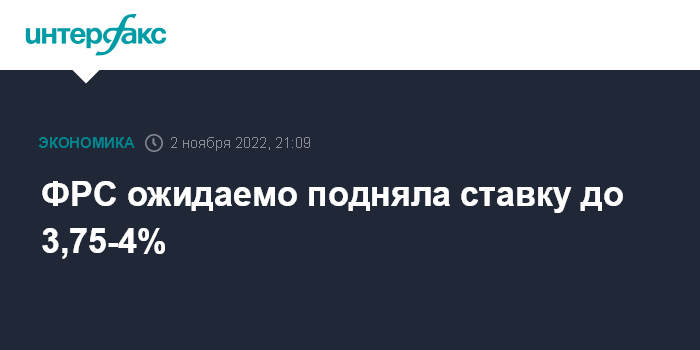 Москва. 2 ноября. INTERFAX.RU - Федеральная резервная система (ФРС) повысила процентную ставку по федеральным кредитным средствам (federal funds rate) на 75 базисных пунктов, теперь ее диапазон составляет 3,75-4% годовых, говорится в заявлении Федерального комитета по операциям на открытом рынке (FOMC) по итогам завершившегося в среду заседания.