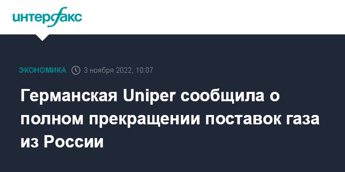 Москва. 3 ноября. INTERFAX.RU - Германская компания Uniper - некогда крупнейший корпоративный покупатель газа "Газпрома" - заявила о полном прекращении поступления российского газа.