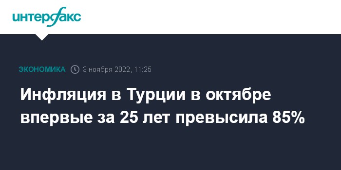 Москва. 3 ноября. INTERFAX.RU - Темпы роста потребительских цен в Турции в октябре ускорились по итогам 17-го месяца подряд, впервые за 25 лет превысив отметку в 85%.