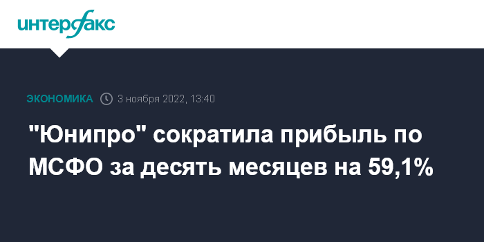 Москва. 3 ноября. INTERFAX.RU - В январе-сентябре 2022 года ПАО "Юнипро" сократило чистую прибыль по МСФО зна 59,1% в годовом измерении, до 5,14 млрд рублей, говорится в отчете компании.