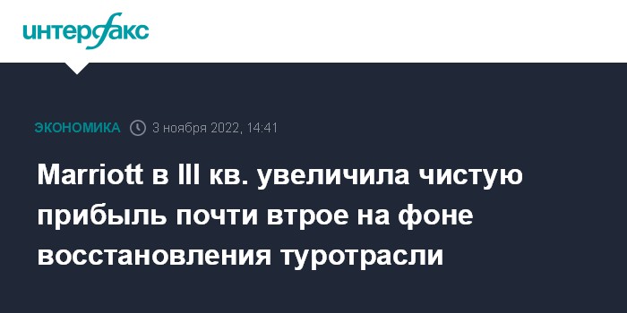 Москва. 3 ноября. INTERFAX.RU - Американская Marriott International, оператор крупнейшей в мире гостиничной сети, в третьем квартале увеличила чистую прибыль почти втрое на фоне восстановления туристической отрасли.