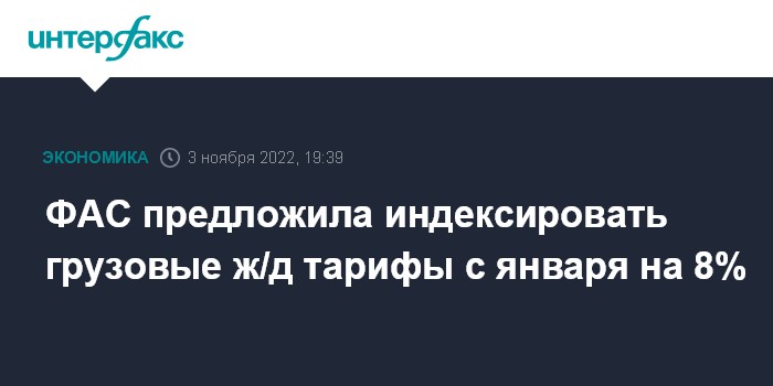 Москва. 3 ноября. INTERFAX.RU - Федеральная антимонопольная служба подготовила предложения по индексации грузовых ж/д тарифов на 2023 год. Проект соответствующего приказа размещен на федеральном портале проектов нормативных правовых актов.