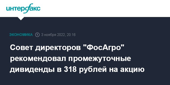 Москва. 3 ноября. INTERFAX.RU - Совет директоров "ФосАгро" рекомендовал выплатить промежуточные дивиденды в размере 318 рублей на акцию, сообщила компания. Рекомендация была дана по итогам обсуждения отчетности компании за 9 месяцев 2022 года.