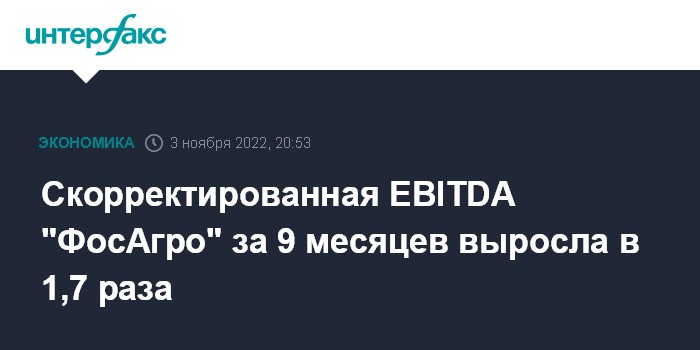 Москва. 3 ноября. INTERFAX.RU - Скорректированная EBITDA "ФосАгро" за 9 месяцев выросла в 1,7 раза, до 222,5 млрд рублей, рентабельность по EBITDA увеличилась до 48,4%, сообщила компания.