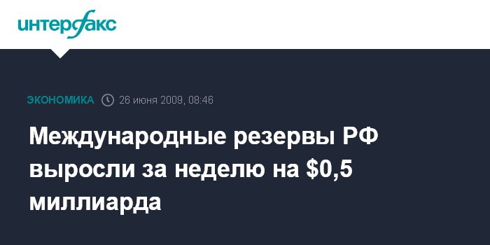 Москва. 26 июня. INTERFAX.RU - Международные резервы России на 19 июня составили $407,1 млрд, сообщил департамент внешних и общественных связей Банка России. Между тем по состоянию на 12 июня международные резервы равнялись $406,6 млрд. Таким образом, за неделю они увеличились на $0,5 миллиарда.
