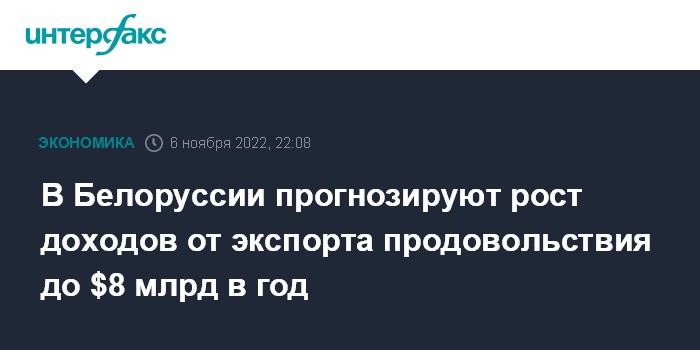 Москва. 6 ноября. INTERFAX.RU - Вице-премьер правительства Белоруссии Леонид Заяц заявил о росте доходов от экспорта продовольственных товаров и сельскохозяйственного сырья, который, по его словам, должен превысить $8 млрд по итогам текущего года.