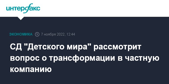 Москва. 7 ноября. INTERFAX.RU - Совет директоров ПАО "Детский мир" планирует рассмотреть решение о поэтапной трансформации компании в частный бизнес.