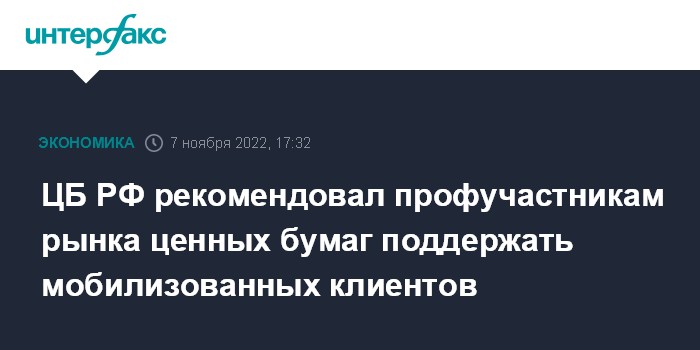 ЦБ РФ рекомендовал профучастникам рынка ценных бумаг поддержать мобилизованных клиентов