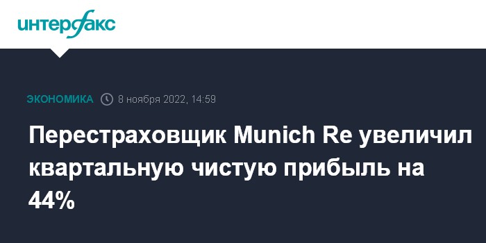 Москва. 8 ноября. INTERFAX.RU - В III квартале 2022 года германская Muenchener Rueckversicherungs-Gesellschaft AG (Munich Re), одна из крупнейших перестраховочных компаний мира, увеличила чистую прибыль на 44%.