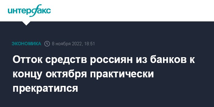 Москва. 8 ноября. INTERFAX.RU - Отток средств населения из банков, наблюдавшийся с конца сентября на фоне отъезда граждан за рубеж, к концу октября практически прекратился, говорится в докладе о денежно-кредитной политике, опубликованном Банком России.
