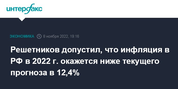 Москва. 8 ноября. INTERFAX.RU - Текущая динамика потребительских цен в РФ указывает на то, что инфляция по итогам 2022 года может оказаться ниже действующего прогноза в 12,4%, ожидается в интервале 12,0-12,4%, заявил глава Минэкономразвития Максим Решетников на совещании по социальным вопросам у президента Владимира Путина.