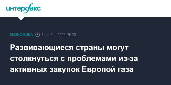 Москва. 8 ноября. INTERFAX.RU - Усиленные закупки Европой газа затрудняют доступ к нему развивающимся странам, что может вызывать в них в предстоящие годы серьезные проблемы с энергетикой, сообщает во вторник Bloomberg.