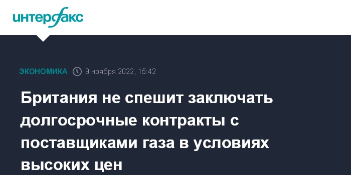 Москва. 9 ноября. INTERFAX.RU - Великобритания стремится найти возможности для обеспечения надежных поставок газа в страну на будущее, однако не спешит с заключением долгосрочных контрактов, учитывая высокий текущий уровень цен на газ, пишет газета Financial Times.