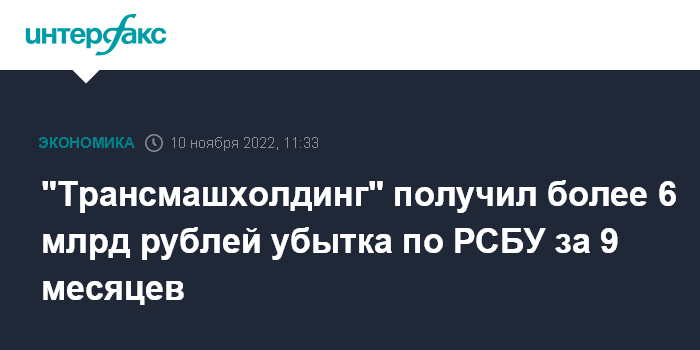 Москва. 10 ноября. INTERFAX.RU - В январе-сентябре 2022 года чистый убыток АО "Трансмашхолдинг" (ТМХ) по РСБУ составил 6,2 млрд рублей против чистой прибыли в размере 4,7 млрд рублей годом ранее, сообщается в бухгалтерской отчетности компании.