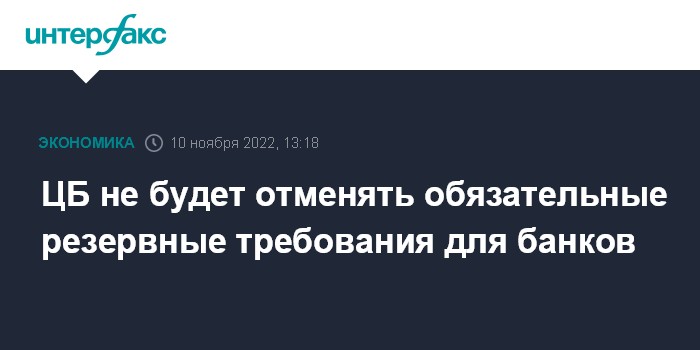 Москва. 10 ноября. INTERFAX.RU - ЦБ РФ не готов пойти на отмену обязательных резервных требований для банков, сообщила председатель ЦБ Эльвира Набиуллина.