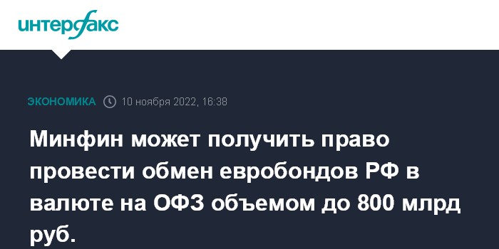 Москва. 10 ноября. INTERFAX.RU - Минфин РФ предложил прописать в бюджете опцию обмена суверенных валютных евробондов, по согласованию с их владельцами, на новые облигации федерального займа номинальной стоимостью до 800 млрд рублей.