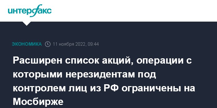 Москва. 11 ноября. INTERFAX.RU - Количество акций предприятий и организаций, на которые распространяются ограничения для совершения операций на "Московской бирже" клиентами-нерезидентами, находящимися под контролем российских юридических или физических лиц, увеличилось до 73.