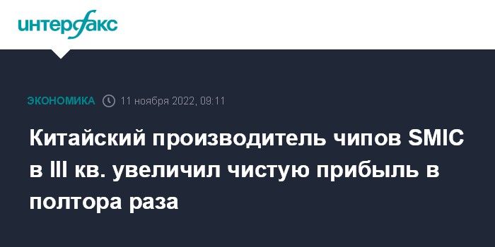 Москва. 11 ноября. INTERFAX.RU - Крупнейший китайский производитель микропроцессоров Semiconductor Manufacturing International Corp. (SMIC) в третьем квартале увеличил чистую прибыль на 47% за счет повышения доходов.