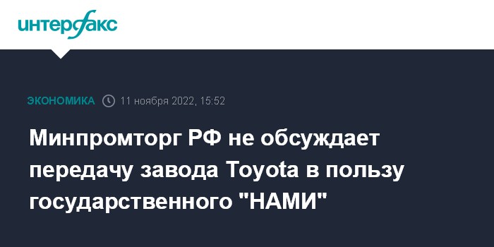 Минпромторг РФ не обсуждает передачу завода Toyota в пользу государственного "НАМИ"