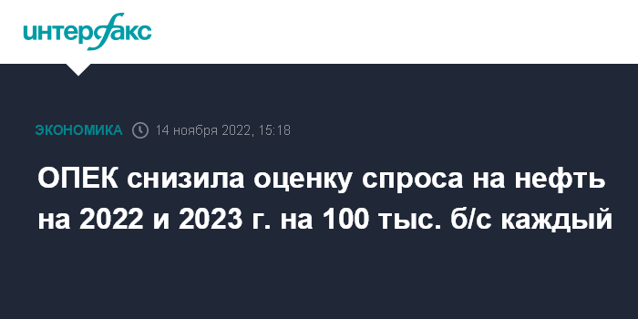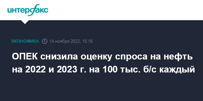 Москва. 14 ноября. INTERFAX.RU - ОПЕК понизила оценку спроса на нефть в 2022 году на 100 тыс. баррелей в сутки - до 99,57 млн б/с, оценка спроса в 2023 году снижена также на 100 тыс. б/с - до 101,82 тыс. б/с, говорится в ежемесячном отчете организации.