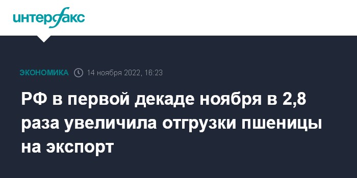 Москва. 14 ноября. INTERFAX.RU - РФ с 1 по 10 ноября отгрузила на экспорт 1,986 млн тонн пшеницы, что в 2,8 раза больше, чем за аналогичный период прошлого года, следует из мониторинга Российского зернового союза.