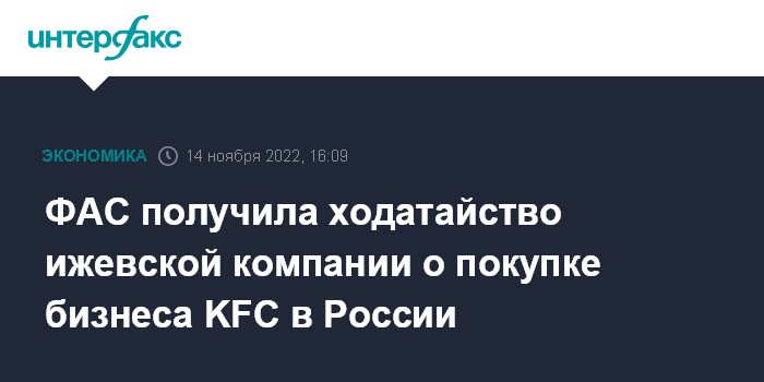 Москва. 14 ноября. INTERFAX.RU - Федеральная антимонопольная служба (ФАС) России получила от ООО "Смарт Сервис Лтд" ходатайство о приобретении российского бизнеса Yum! Restaurants - ресторанов быстрого питания KFC.