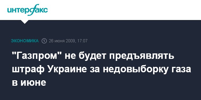 Москва. 26 июня. INTERFAX.RU - ОАО "Газпром" не будет предъявлять штраф Украине за недовыборку газа в июне, сообщил глава компании Алексей Миллер на пресс-конференции в пятницу.