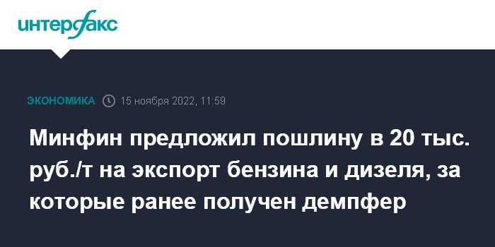 Москва. 15 ноября. INTERFAX.RU - Минфин России направил в ведомства на согласование проект постановления о пошлине в 20 тысяч руб./т на экспорт бензина и дизельного топлива, за которые ранее получен топливный демпфер, сообщил "Интерфаксу" замглавы ведомства Алексей Сазанов.