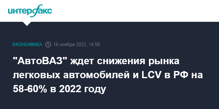 Москва. 16 ноября. INTERFAX.RU - В 2022 году рынок легковых и легких коммерческих автомобилей в России может сократиться до 670-700 тысяч машин, что соответствует снижению на 58-60%, прогнозируют в "АвтоВАЗе".