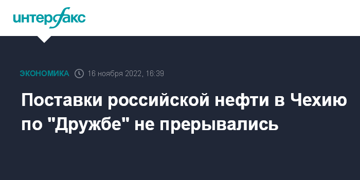 Москва. 16 ноября. INTERFAX.RU - Поставки российской нефти по трубопроводу "Дружба" в Чехию продолжаются, сообщил чешский оператор MERO.
