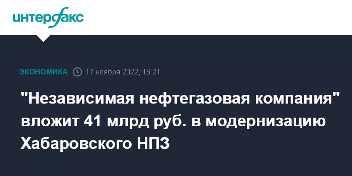 "Независимая нефтегазовая компания" вложит 41 млрд руб. в модернизацию Хабаровского НПЗ