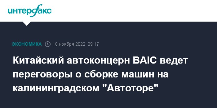Москва. 18 ноября. INTERFAX.RU - Китайский государственный автомобильный концерн Beijing Automotive Industry Holding Co (BAIC) и российский "Автотор" ведут переговоры о сборке машин в Калининграде, пишет газета "Ведомости".