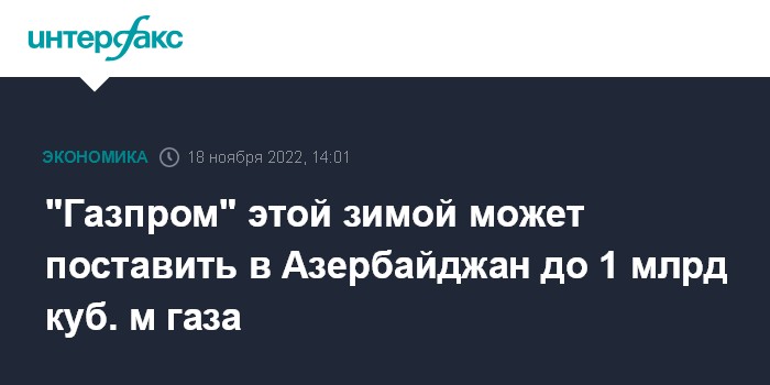 Москва. 18 ноября. INTERFAX.RU - "Газпром" этой зимой может поставить в Азербайджан до 1 млрд куб. м газа, сообщила российская компания.