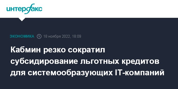 Это второе с апреля сокращение субсидирования льготных кредитов для системообразующих IT-компаний. В сентябре кабмин урезал финансирование льготных кредитов для системообразующих аккредитованных IT-компаний на пополнение оборотных средств в шесть раз - до 500 млн рублей с 3 млрд рублей. Объем выданных кредитов IT-компаниям в 2022 году был сокращен до 20 млрд рублей с изначальных 54,5 млрд рублей.